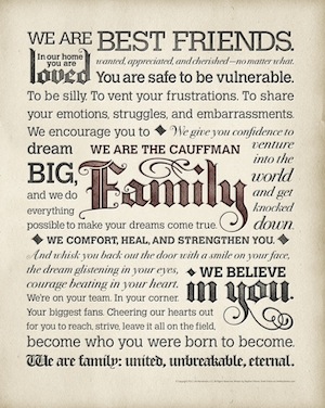 “We are best friends. In our home you are loved, wanted, appreciated, and cherished no matter what. You are safe to be vulnerable. To be silly. To vent your frustrations. To share your emotions, struggles, and embarrassments. We encourage you to dream big, and we do everything possible to make your dreams come true. We give you confidence to venture into the world and get knocked down. We comfort, heal, and strengthen you. And whisk you back out the door with a smile on your face, the dream glistening in your eyes, courage beating in your heart. We believe in you. We’re on your team. In your corner. Your biggest fans. Cheering our hearts out for you to reach, strive, leave it all on the field, become who you were born to become. We are family: united, unbreakable, eternal.”